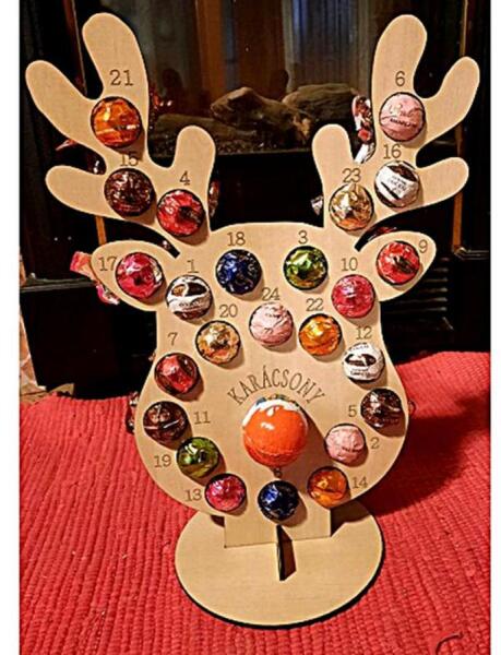 Rénszarvasfej alakú adventi naptár lapraszerelten, MDF. Csokoládé nélkül szállítjuk :)  Aranyos karácsony-váró dekoráció otthonodba, és ahogy fogy a csoki, úgy közelednek a karácsony csodálatos napjai.